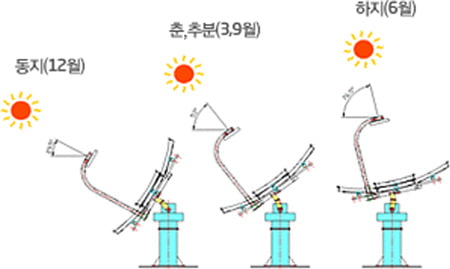 제품의특성태양의 고도 및 방위각을 자동으로 추적해 최적의 집광, 집열 성능 유지 → 1일 평균 8시간 발전 및 집열 15극한 기온 (-30) 정상작동 2간편한 조립 6방위각(X축) 이동범위 : 0 ~ 220° 3하중 별 다양한 모델 7고도각(Y축) 이동범위 : 20° ~ 80° 430m/s 풍속 정상작동
